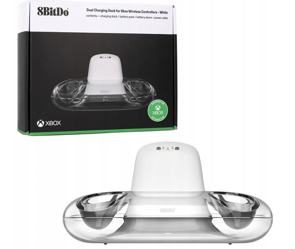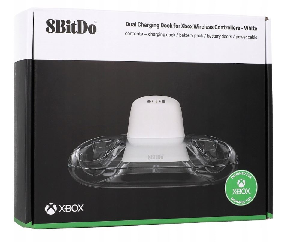 V paketu je polnilna postaja 8BitDo, dve bateriji za gamepade s kapaciteto 1100 mAh, štirje pokrovčki za zapiranje baterij (2 za Xbox Series X/S in 2 za Xbox One) in napajalni adapter. Krmilniki niso del tega kompleta.