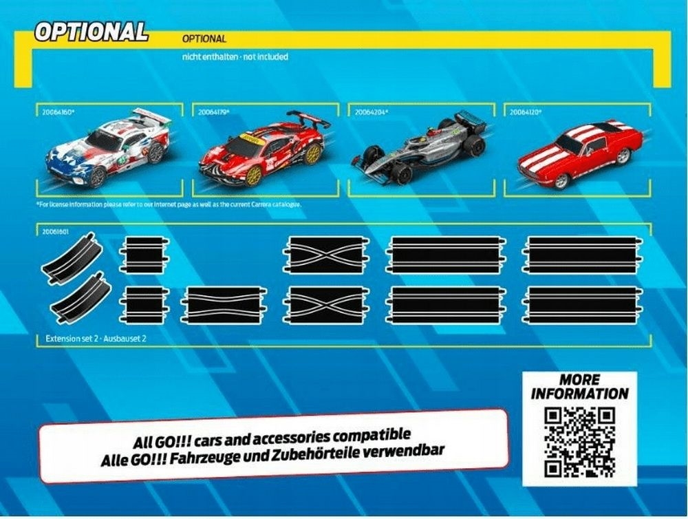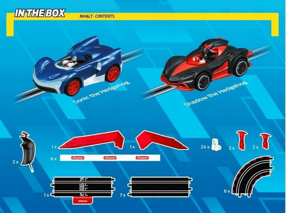 Vsebina paketa: proga, 2 avtomobilčka, ravnine, zavoji, skakalnica, napajalni del, 2x regulator hitrosti, opore, ograje, navodilo.