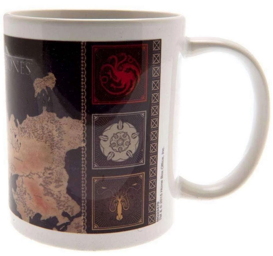 Bela keramična skodelica z logotipom serije in zemljevidom Westerosa.