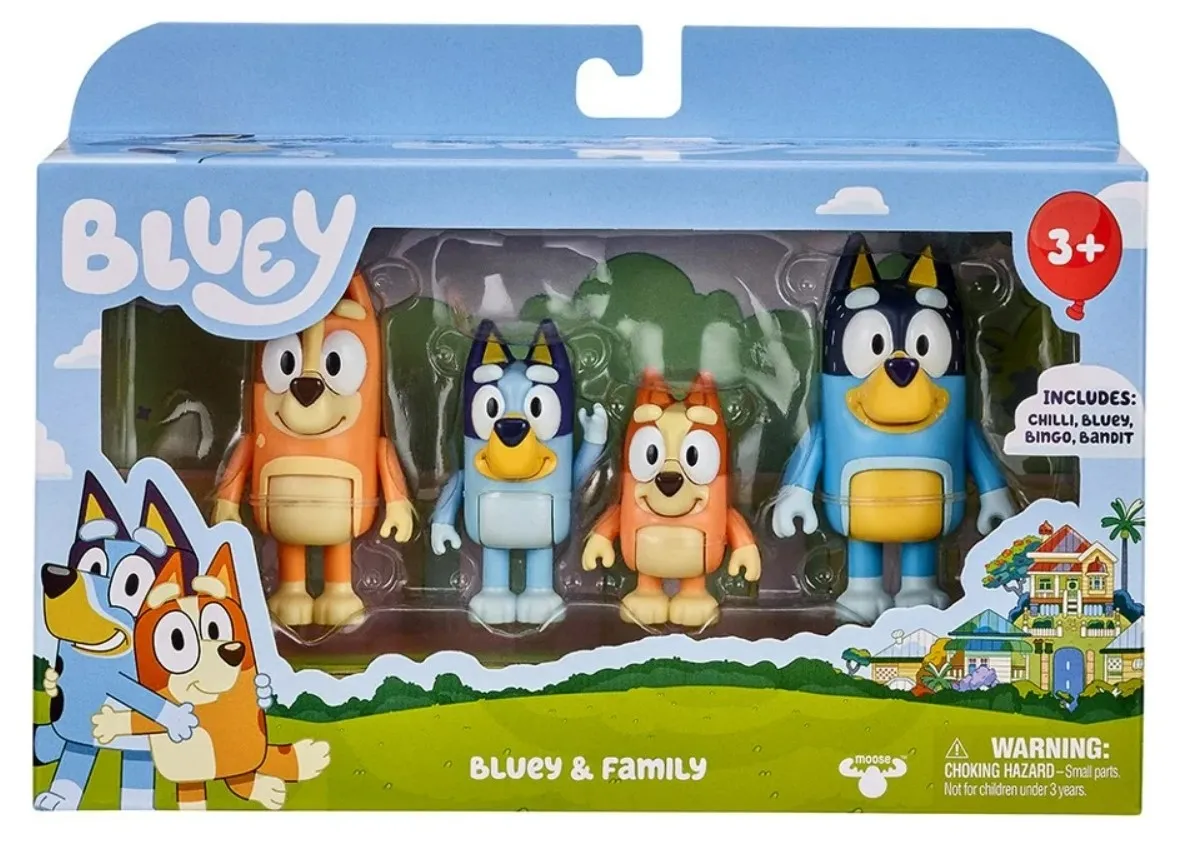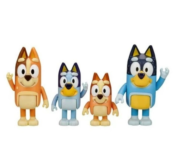 Zberi celo pasjo družinico iz otroške serije s tem kompletom, ki vsebuje figurice Bluey, njeno sestrico Bingo, mamo in očeta. Figurice imajo gibljive sklepe za več zabave pri igri.