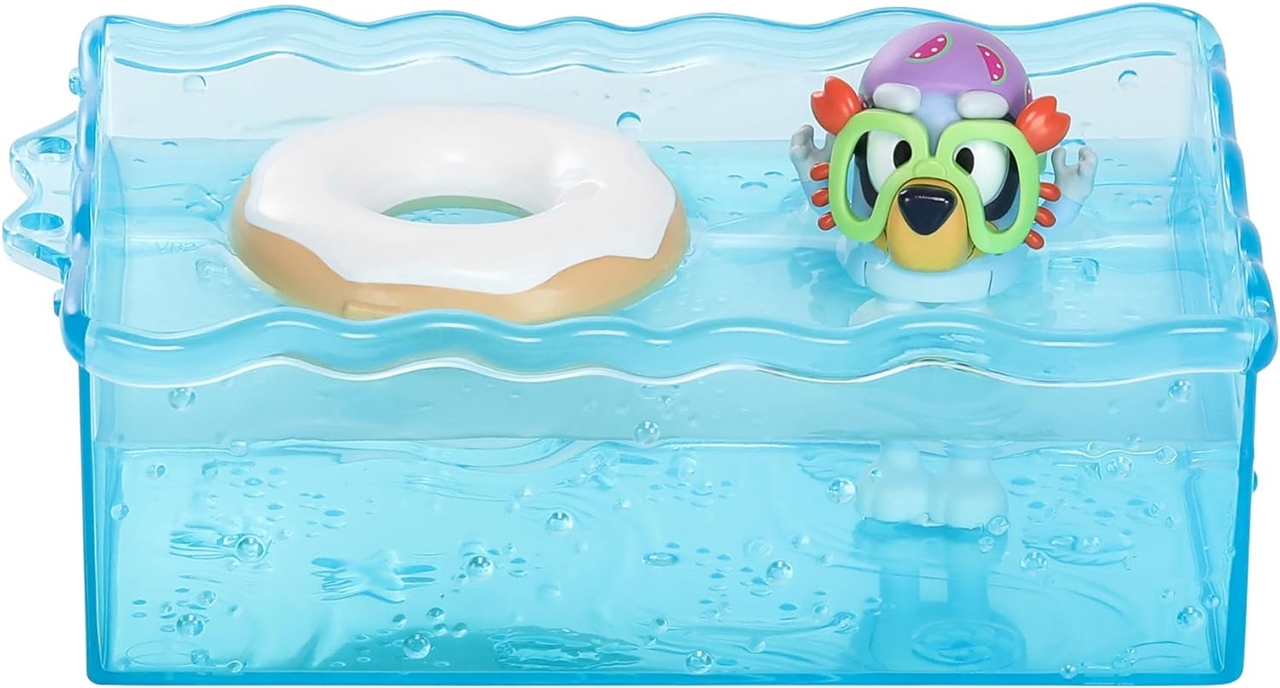 ekskluzivna figurica Bluey nosi plavalna očala, ki ji pomagajo videti pod vodo
