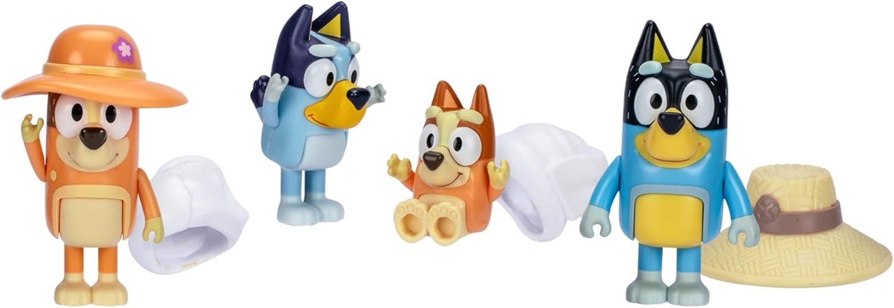 Zabavajte se z Bluey z novim kompletom štirih figuric na temo Družinski izlet! Vsa družina Heelerjev je tukaj, da se z vami igra – Bluey, Bingo, Chilli in Bandit! Bandit in Chilli imata na glavah klobuke, medtem ko sta Bluey in Bingo pripravljeni sprostiti se z brisačami, ovitimi okoli glave!