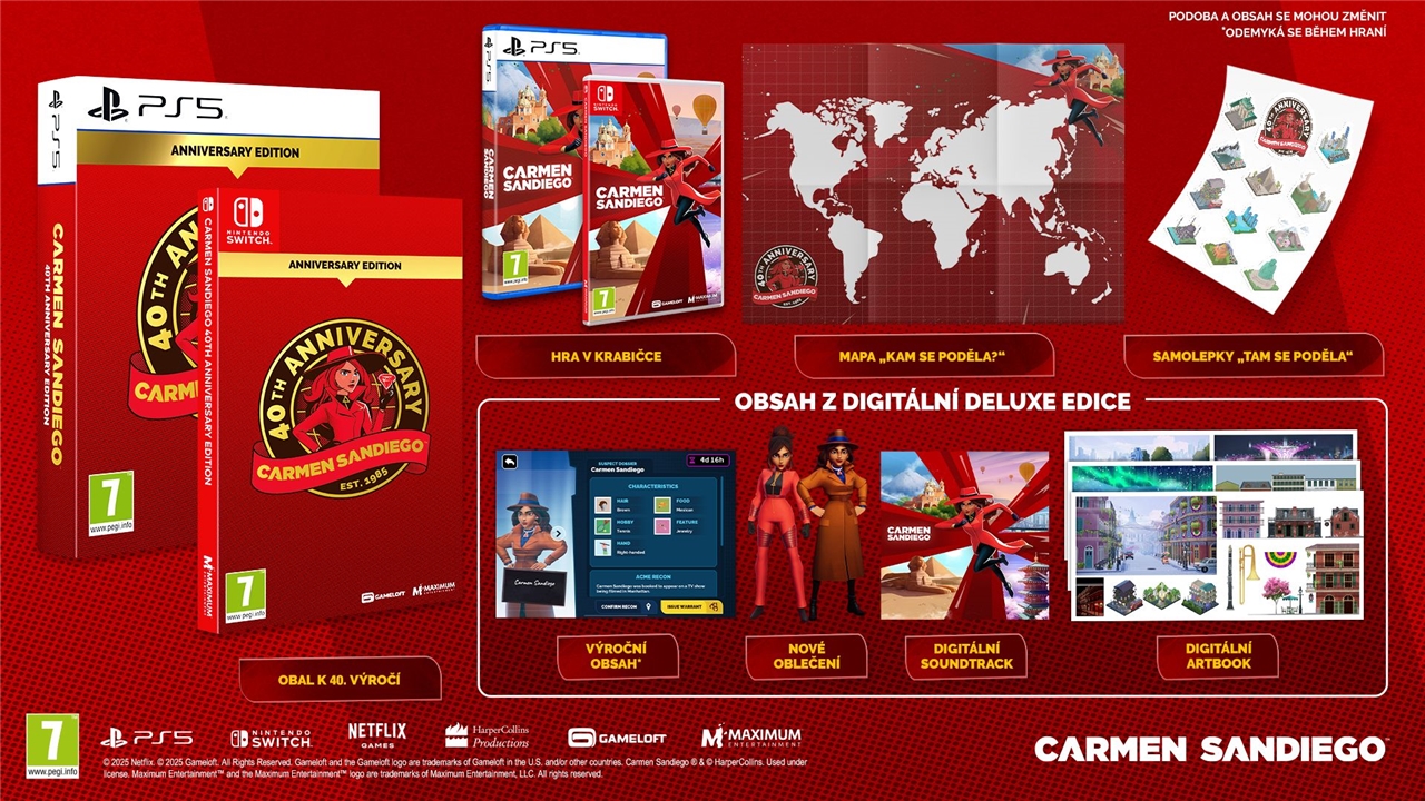 Fizična izdaja ob 40. obletnici vsebuje tudi zemljevid „Kam je izginila?“, nalepke „Tam je izginila“, poseben digitalni vsebinski paket ob 40. obletnici Carmen Sandiego, klasično in motoristično obleko za Carmen, digitalni soundtrack in digitalni artbook.