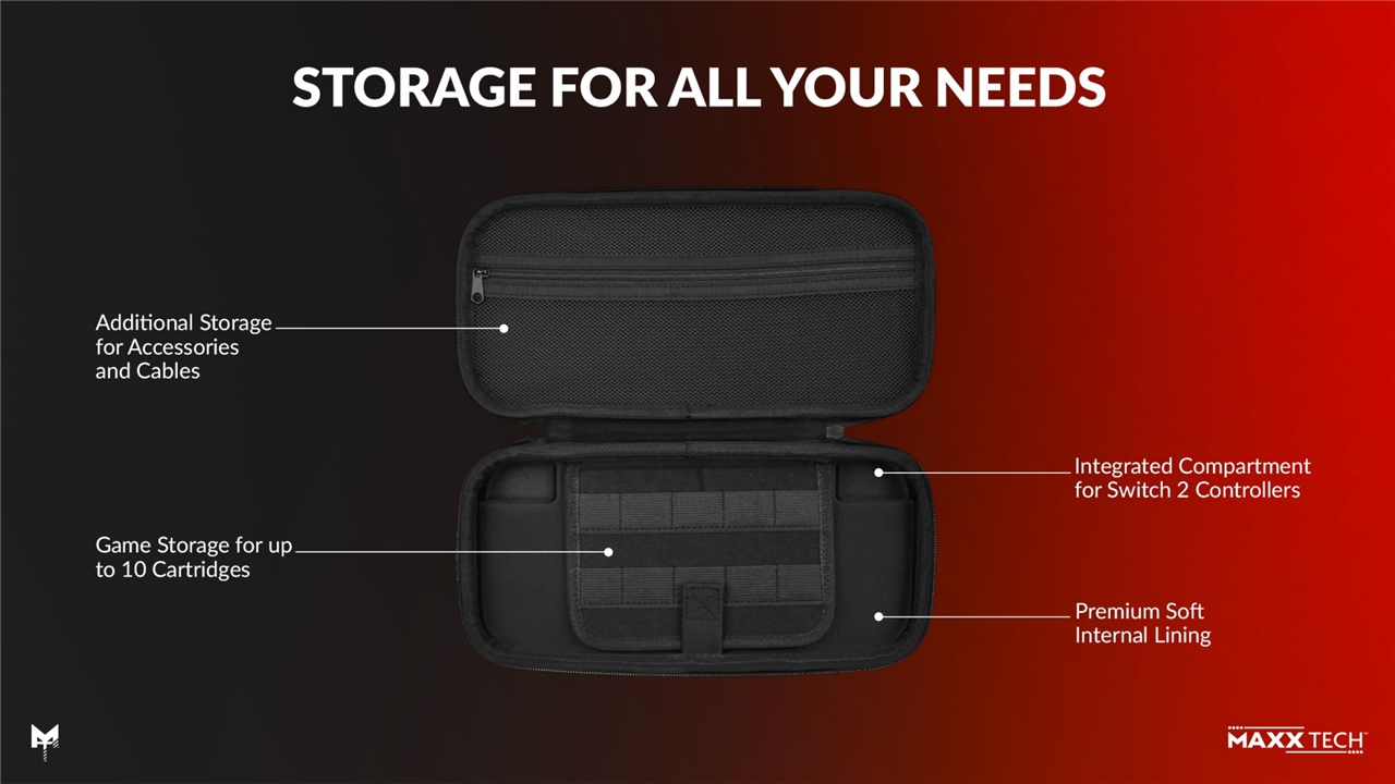 notranjost po meri: namenski predelki za vaš Nintendo Switch™ 2&1, krmilnike Joy-Con in igralne kartice, da bo vse varno in urejeno
