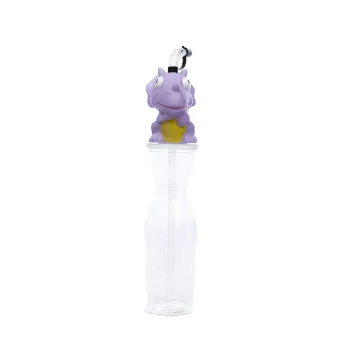 Prozorna plastična steklenica z barvitim dinozavrom iz mehkega PVC na pokrovčku in upogljivo slamico za pitje.