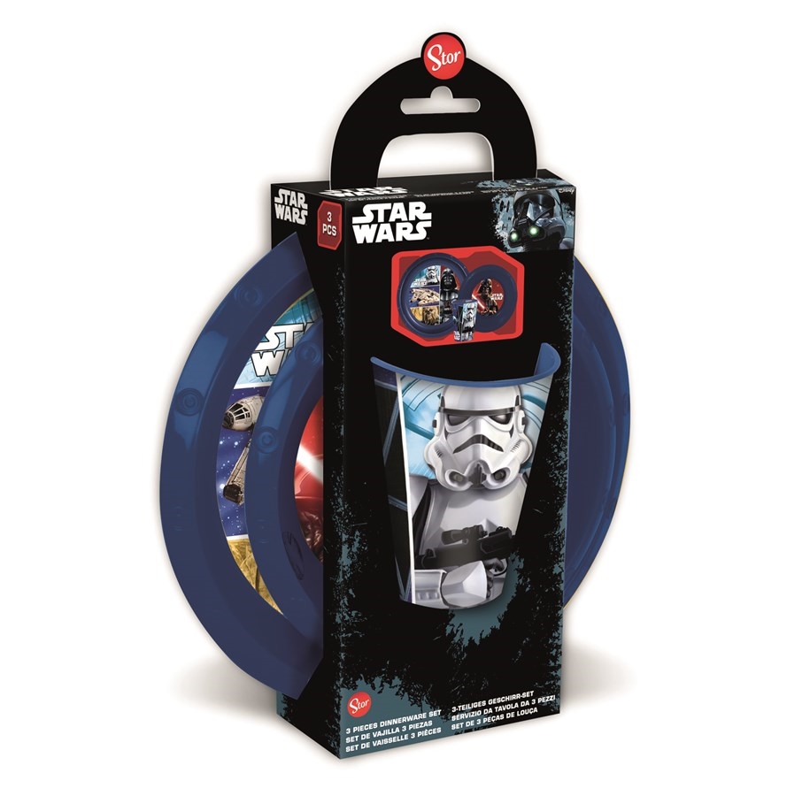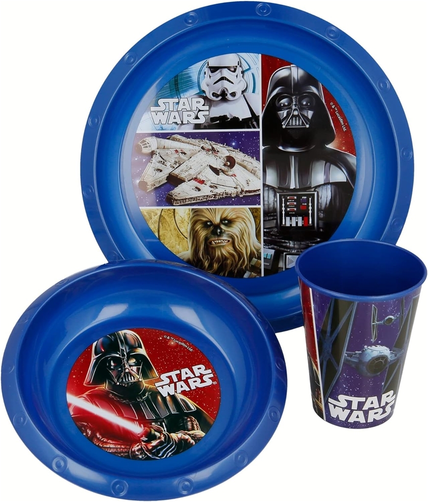 Star Wars. Primerno za pomivalni stroj le pri nizkih temperaturah pranja posode. Komplet je primeren za uporabo v mikrovalovni pečici do največ dveh minut.