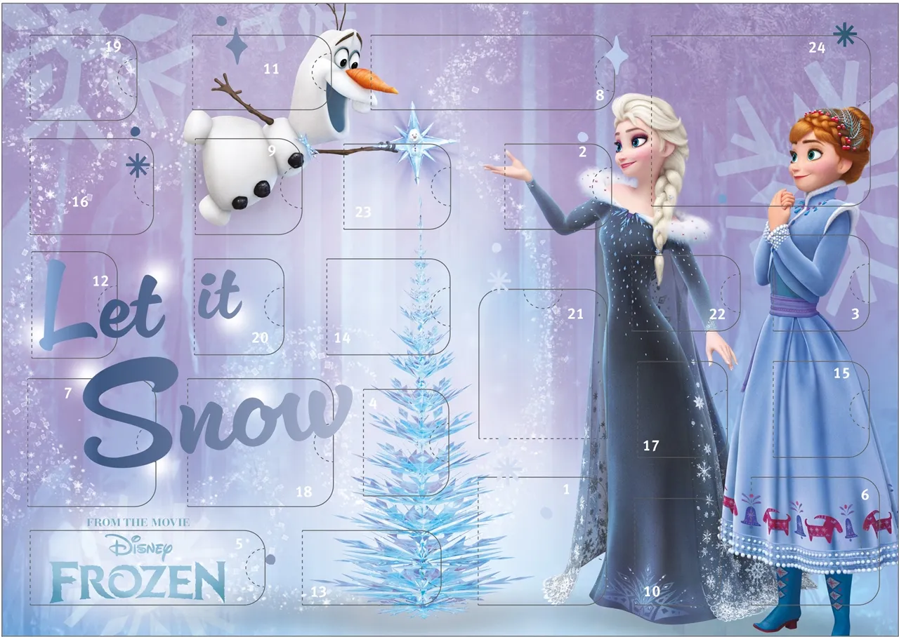 Uživajte v pričakovanju božiča z adventnim koledarjem s motivom priljubljenih filmov serije Ledeno kraljestvo (Disney: Frozen)! Vsak dan lahko otroci odprejo eno od 24 okenc, za katerim jih čaka majhno presenečenje, navdihnjeno s priljubljenimi liki iz teh čarobnih Disneyjevih filmov.