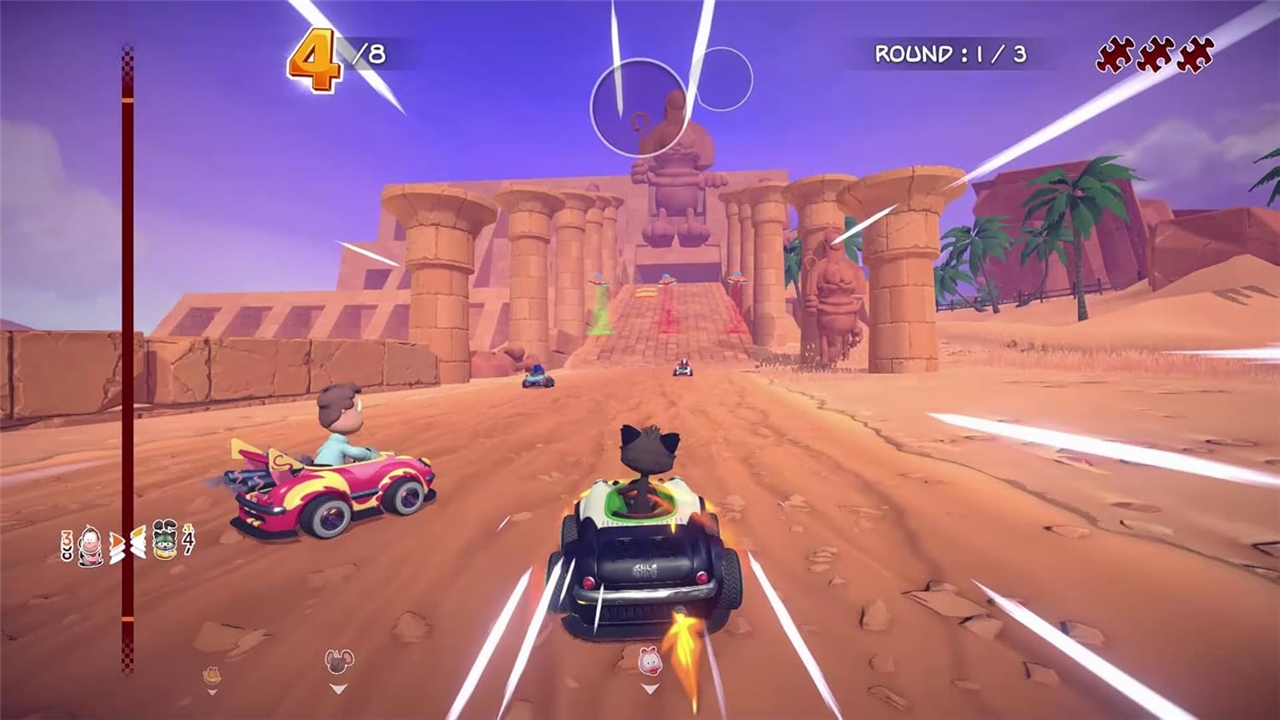 Izberi svoj najljubši lik in izberi gokart glede na njegove lastnosti in tvoj vozni slog, čim natančneje začni dirko in s kontroliranimi drsenji prehiti nasprotnike v ovinkih. Zahvaljujoč norim bonusnim predmetom, kot sta blazina ali čarobna palica, pridobi prednost pred ostalimi in prevozi ciljno črto kot prvi. In če si tako len kot Garfield, uporabi vzmet, pojdi po bližnjici in pokaži vsem nasprotnikom hrbet! Na skupno šestnajstih progah iz Garfieldovega sveta lahko poleg tega dirkaš tudi s prijatelji, in sicer v lokalni ali spletni igri.