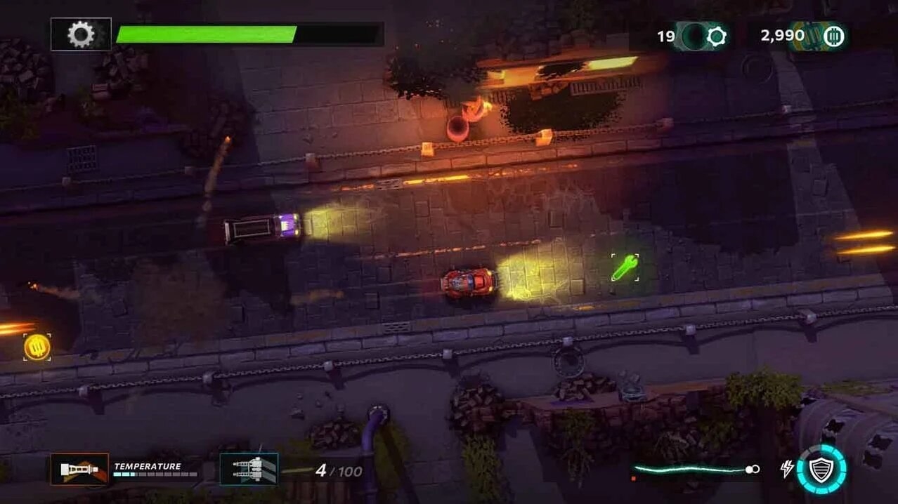 Vozite in uničujte: Zahvaljujoč preciznemu upravljanju in svojemu vrhunskemu vozniškemu znanju plešite s svojim avtom okoli sovražnikov, spretno se izogibajte njihovim strelom in jim odgovorite z intenzivnim obstreljevanjem. Pričakujte visokooktansko akcijo polno ostrih manevrov, drsenj in zasukov!