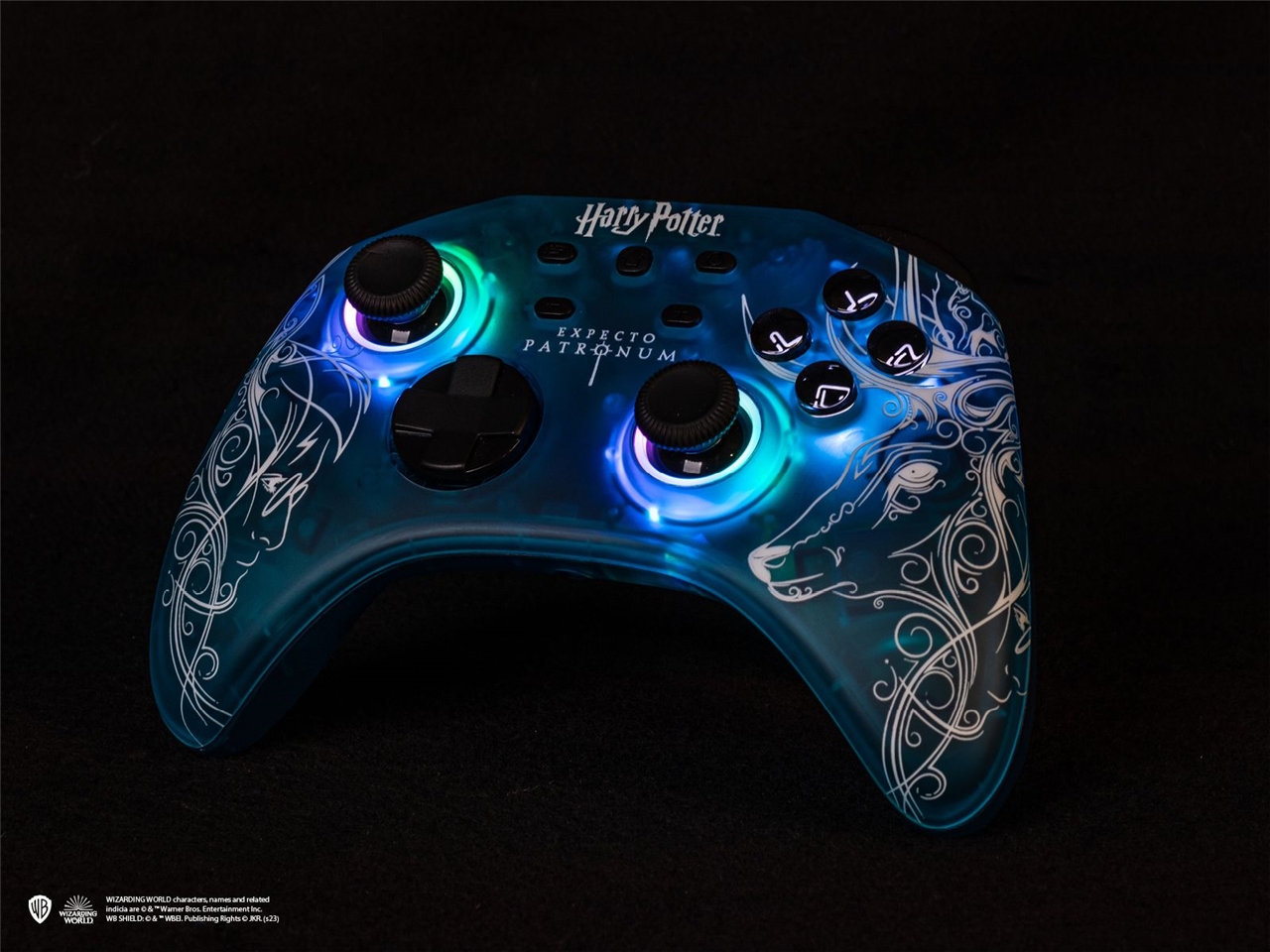 Ta uradno licenciran brezžični igralni krmilnik z motivom uroke Patronusa iz priljubljenega čarovniškega sveta Harryja Potterja je namenjen vsem lastnikom igralnih konzol Nintendo Switch in Nintendo Switch – OLED Model. Krmilnik na prvi pogled pritegne ne le s čudovito upodobljenim motivom, ki prikazuje Harryja s svojim živalskim patronom, temveč tudi z barvno osvetlitvijo okoli analognih palic in akcijskih tipk. Poleg standardnih elementov, kot so dve zgornji tipki, dve sprožilki, par vibracijskih motorjev in podpora za gibalno upravljanje, krmilnik prav tako ponuja dve programabilni tipki, štiri LED indikatorje za spremljanje stanja napolnjenosti in poteka polnjenja vgrajene polnilne baterije ter gumb Turbo, s katerim je ponavljajoče pritiskanje tipk in sprožilk lažje.