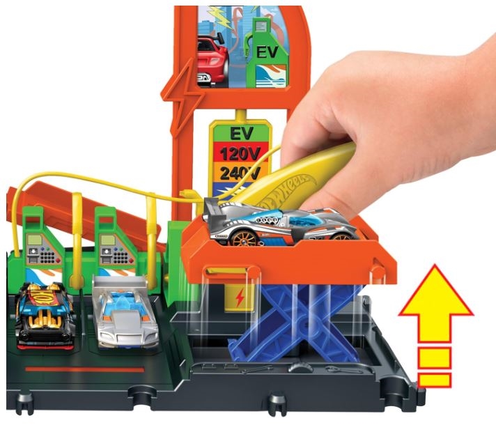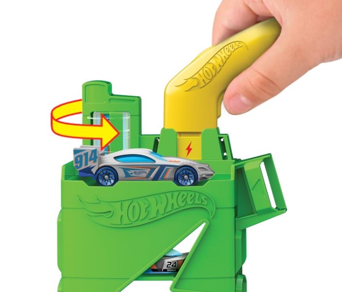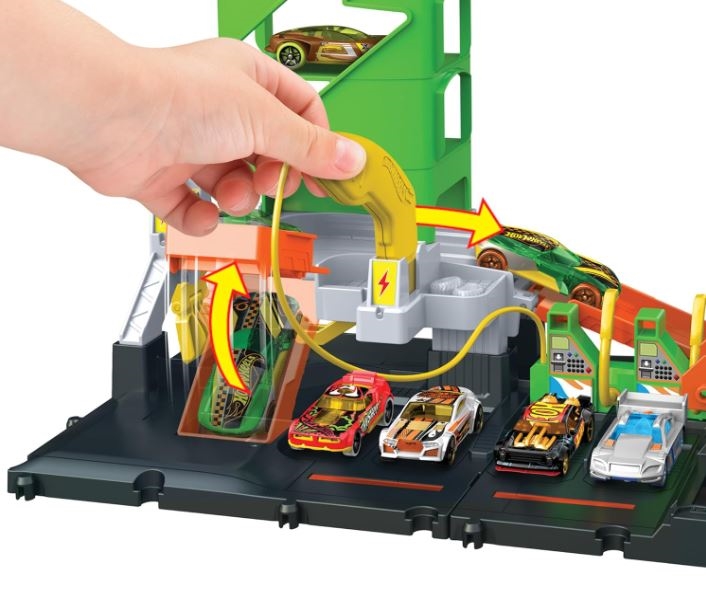 Pripravite se na igro na progi, polni akcije, s Super polnilno postajo Hot Wheels City! Ta interaktivni igralni set vsebuje nastavljiv ročaj za polnjenje, ki spominja na električno vozilo, katerega otroci vstavijo na označena mesta in tako aktivirajo odlične podrobnosti, na primer menjavo oznak, dvigala za avtomobile in izstreljevalne naprave. Parkirajte na postaji 10 avtomobilčkov v merilu 1:64 za nadaljnjo igro in shranjevanje. En avtomobilček Hot Wheels je v kompletu, ostala vozila se prodajajo ločeno. Super polnilna postaja se poveže z drugimi seti in progami Hot Wheels, tako da si otroci lahko sestavijo svojo edinstveno mestno sceno za pustolovščine brez konca.