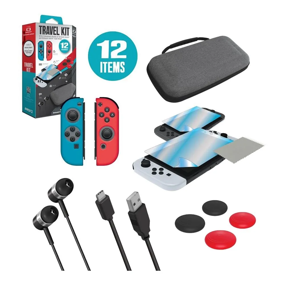 Potovalni komplet Armor3 za Nintendo Switch vsebuje zaščitno potovalno torbico, 150 cm dolg polnilni kabel Type-C, gumice za analogne palčke, par silikonskih zaščitnih prevlek za krmilnike, zaščitno folijo zaslona in slušalke.