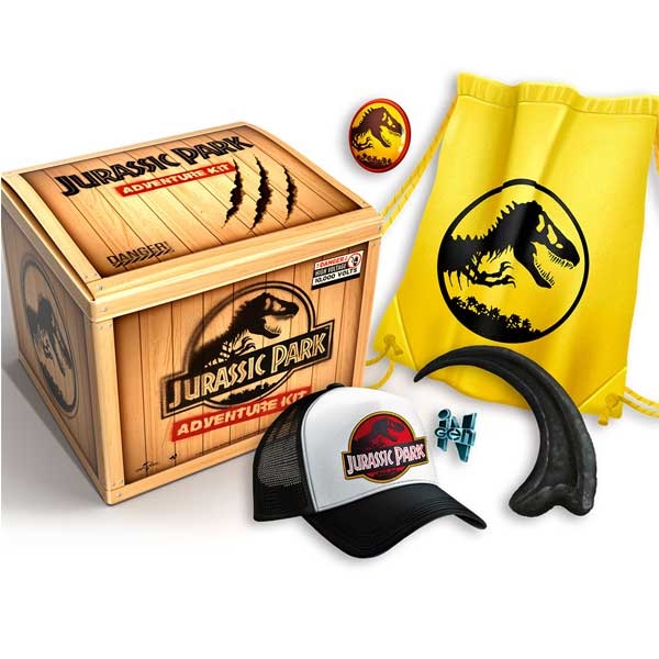 Vsebina pakiranja: krempelj velociraptorja, kapa Jurassic Park, torba Jurassic Park, značka z logotipom Jurassic Park, značka z logotipom INGEN