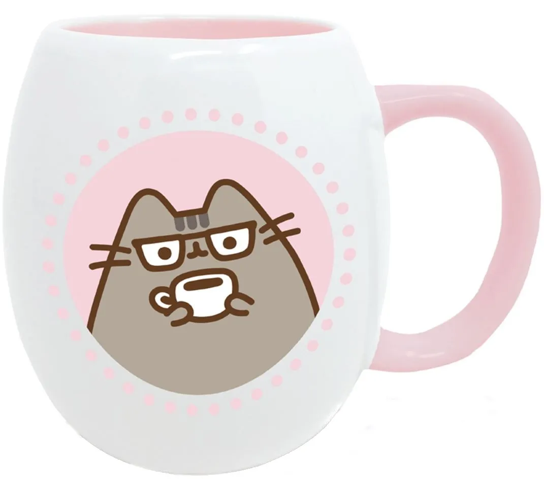 Uradni izdelek - keramična skodelica in dodatni izdelki iz kataloga izdelkov z logotipom in grafiko animirane mačke Pusheen.