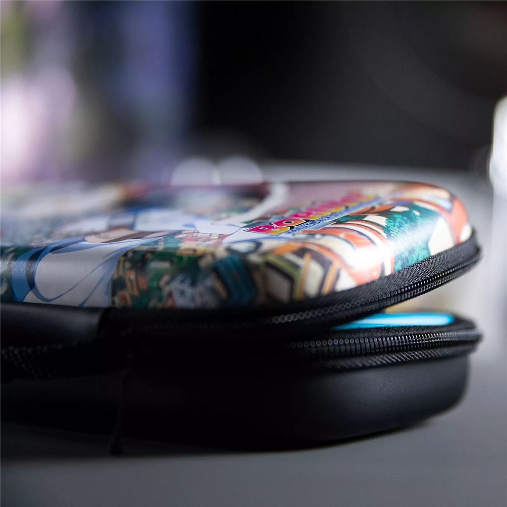 Ovitek ima ročaj za enostavno nošenje in zapiranje z zadrgo. Notranjost vsebuje mrežico za shranjevanje dodatne opreme, kot so joy-coni ali kabli. Pregrada za zaščito zaslona ima 8 žepov za shranjevanje igralnih kartic.