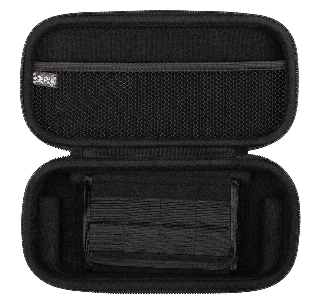 Torbica ima ročaj za enostavno nošenje in zapiranje z zadrgo. Znotraj je mrežica za shranjevanje dodatne opreme, kot so joy-coni ali kabli. Pregrada za zaščito zaslona ima 8 žepkov za shranjevanje igralnih kartic.