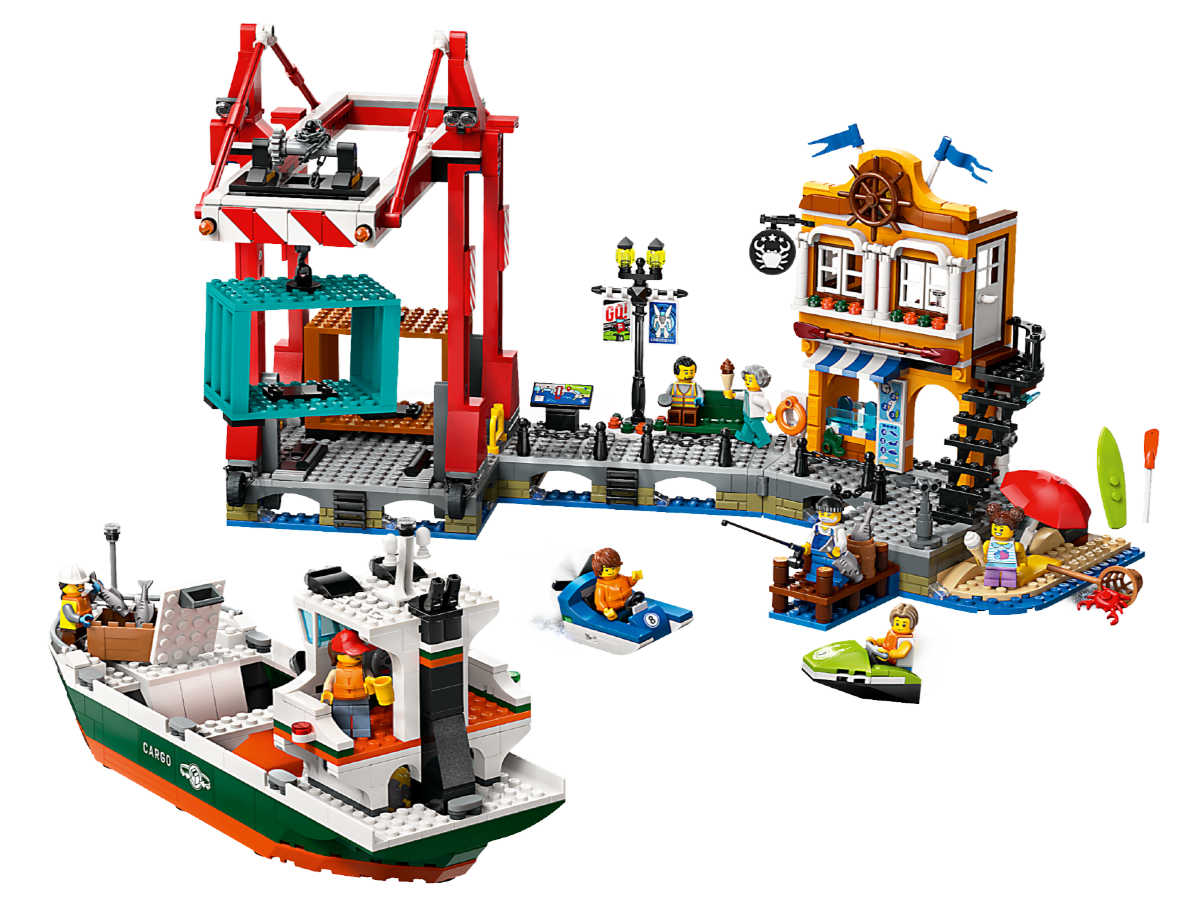 Ta ustvarjalni komplet vsebuje ladjo iz kock LEGO®, 2 tovorna zabojnika, delujoč žerjav za zabojnike, pristanišče s trgovino in restavracijo, vodni skuter, pedalin in 8 minifiguric.