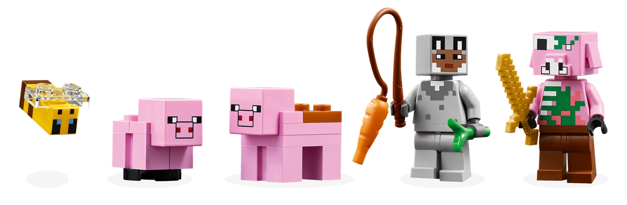 Ta kreativna igrača za gradnjo hiš, postavljena v gozdni biom Minecraft, vsebuje veliko figuric iz priljubljene videoigre: junaka v volčjem skinu, malega prašička, čebelico, odraslega prašiča in zombificiranega piglina. Otroci lahko ponovijo dogajanje iz igre, na primer osedlajo odraslega prašiča, mu obesijo korenček pred nos in se zapeljejo po hiši in vrtu v obliki prašička. Na voljo sta kmetijsko zemljišče s krompirjem in repo za sajenje ter polje z vratci, skozi katera lahko preide mali prašiček. Otroci se lahko izognejo zombificiranemu prašičku, ki jim želi pokvariti zabavo, tako da vstopijo v hišo, kjer sta postelja, knjižnica in mizica za ustvarjanje, ki spodbujata k domiselnim igram.
