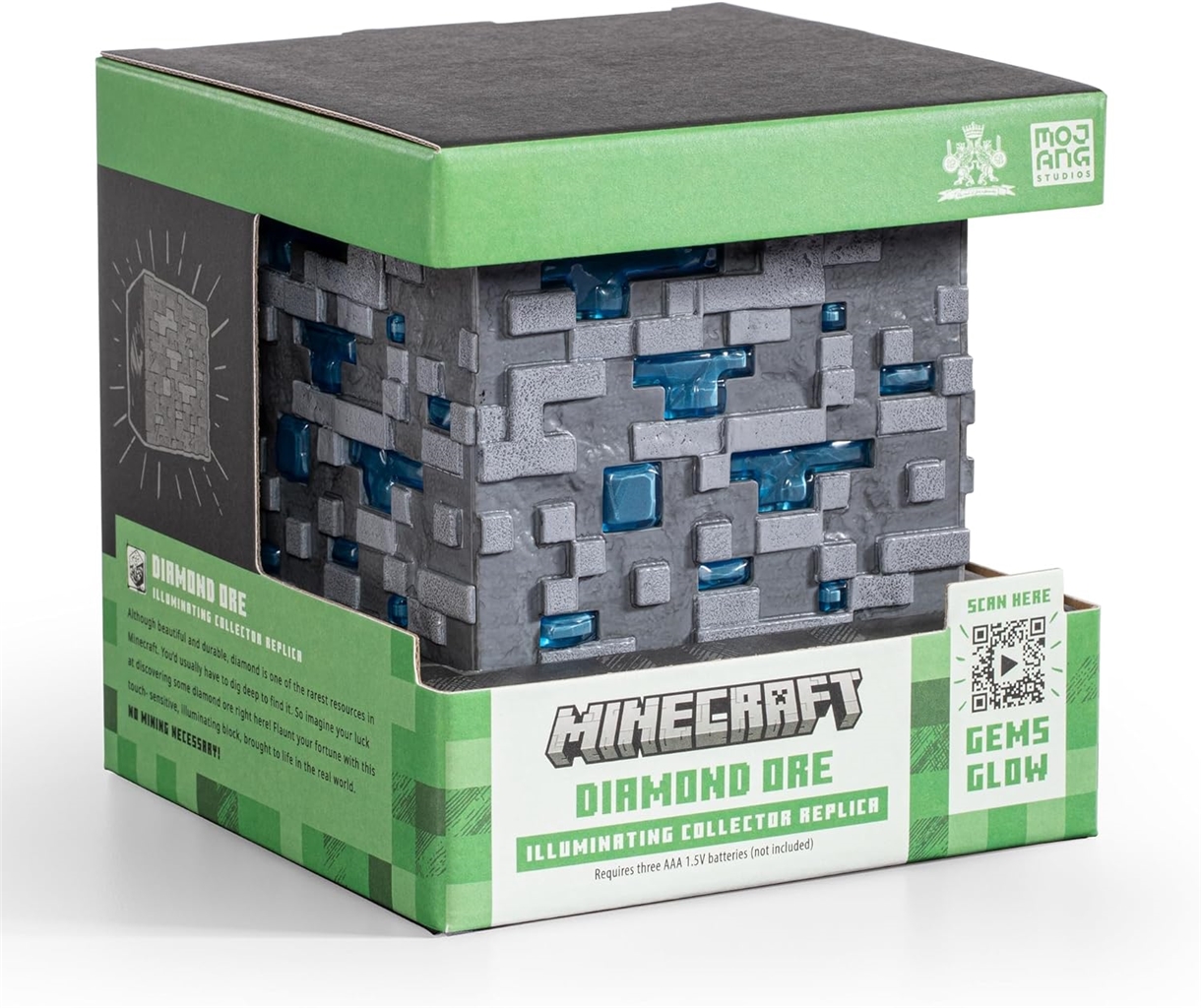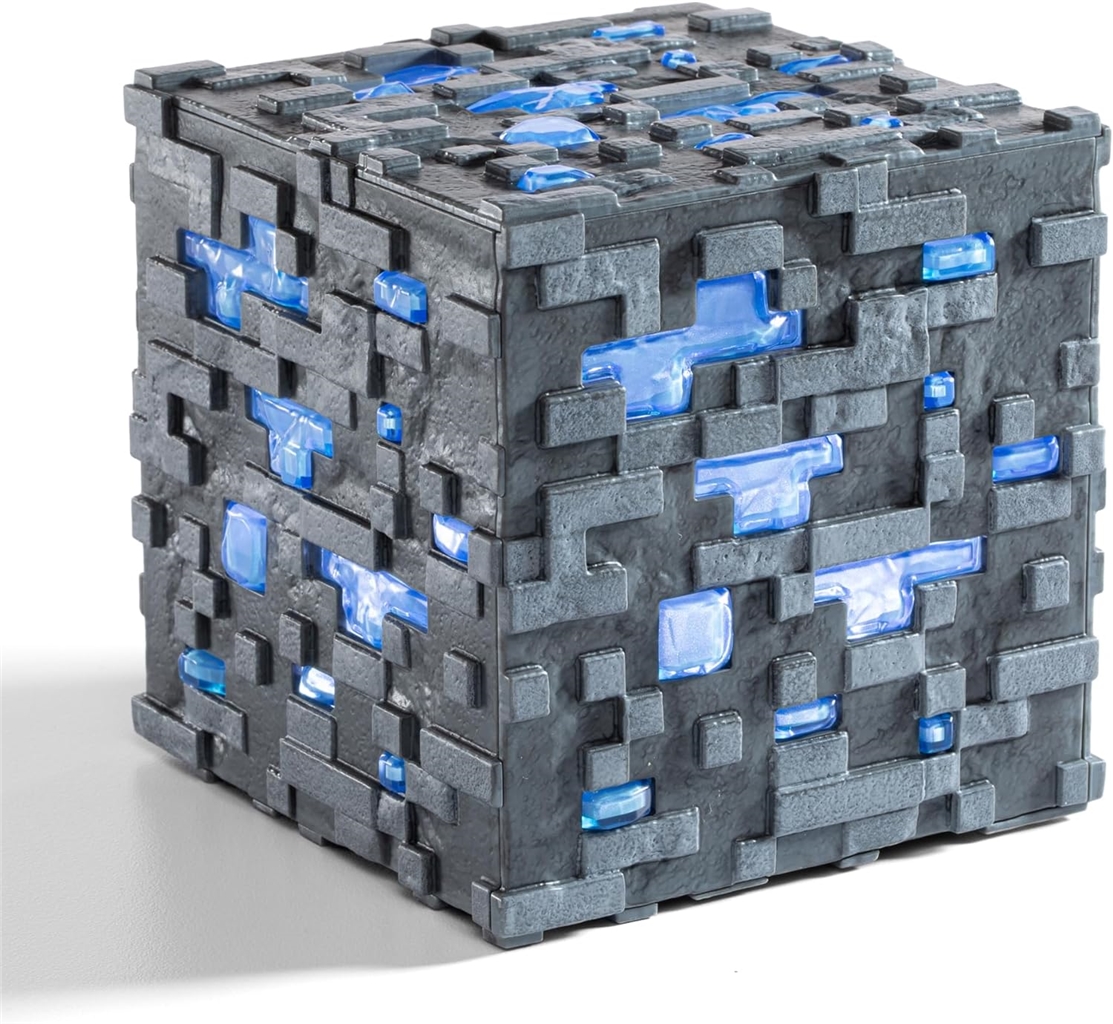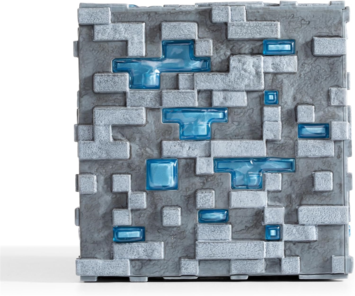 Zbirateljska replika diamantne kocke, ki jo poznate iz Minecrafta. Natančno izdelana. Kocka sveti, za dosego svetlečega učinka so potrebne baterije AAA, ki niso vključene v embalažo. Dimenzije: 13.70 cm x 13.70 cm x 13.70 cm. Uradno licencirano.