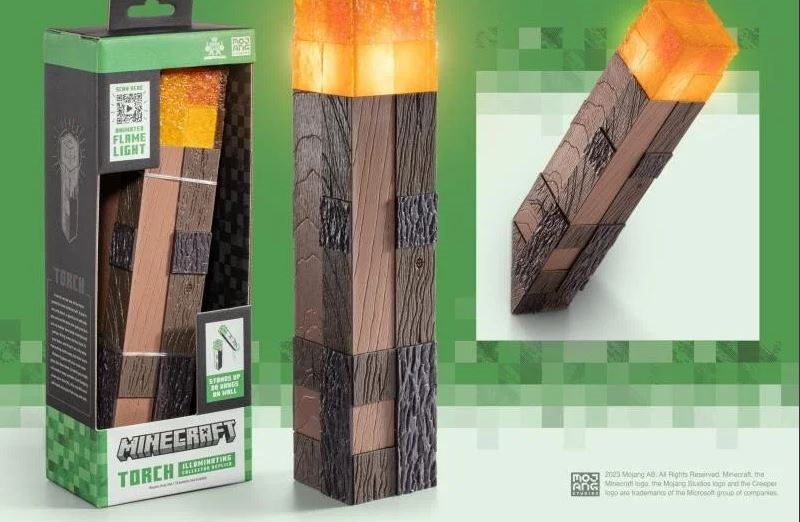 Zbirateljska replika bakle, ki jo poznate iz Minecrafta. Podrobno izdelano. Bakla sveti. Za dosego svetlobnega učinka so potrebne baterije AAA, ki niso priložene v paketu. Dimenzije: 27,80 cm x 11,00 cm x 7,00 cm. Uradno licencirano.
