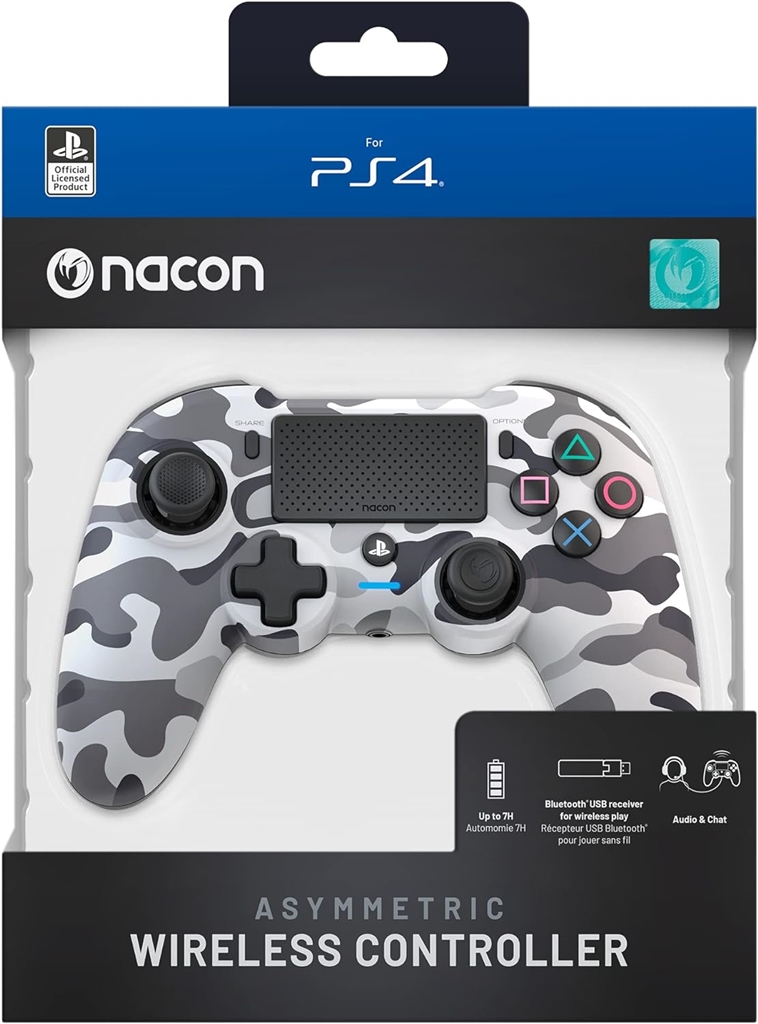 Brezžični krmilnik Nacon Asymmetric Wireless Controller, namenjen vsem lastnikom igralne konzole PlayStation 4, navduši poleg nesimetrično nameščenih palčk tudi z večjimi sprožilci, večjimi zadnjimi akcijskimi gumbi, elegantnim sijočim notranjim robom okoli palčk in teksturirano površino, ki omogoča bolj udoben oprijem. Brezžični način delovanja preko Bluetooth do razdalje do sedmih metrov od konzole. Z enim polnjenjem lahko igrate do sedmih ur, nato pa lahko krmilnik ponovno napolnite s kablom Micro USB.