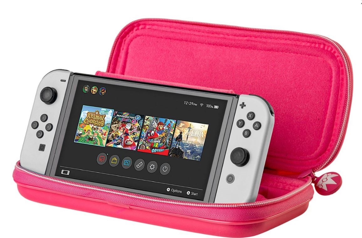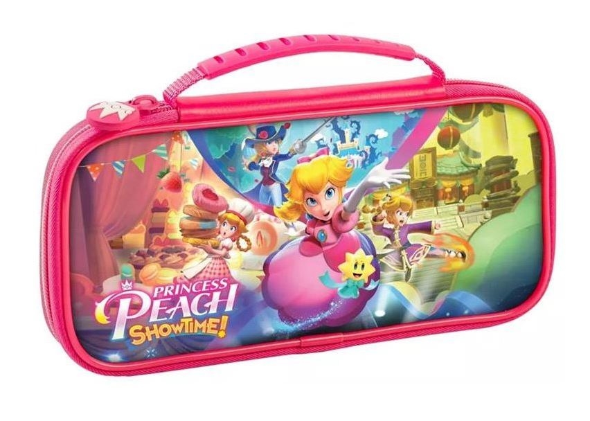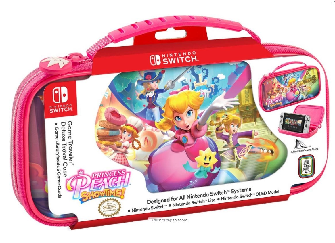 Licenčni potovalni etui Nintendo Switch Game Traveler Deluxe za model Nintendo Switch, Nintendo Switch Lite ali Nintendo Switch OLED. Ima vgrajeno stojalo za enostavno nastavitev želenega kota gledanja. Potovalni etui Princess Peach Deluxe je zasnovan za vse sisteme Nintendo Switch. Vključuje prostor za igralne kartice, ki sprejme 5 igralnih kartic, skupaj z držalom za kartice Micro SD, ki sprejme 2 kartici Micro SD.