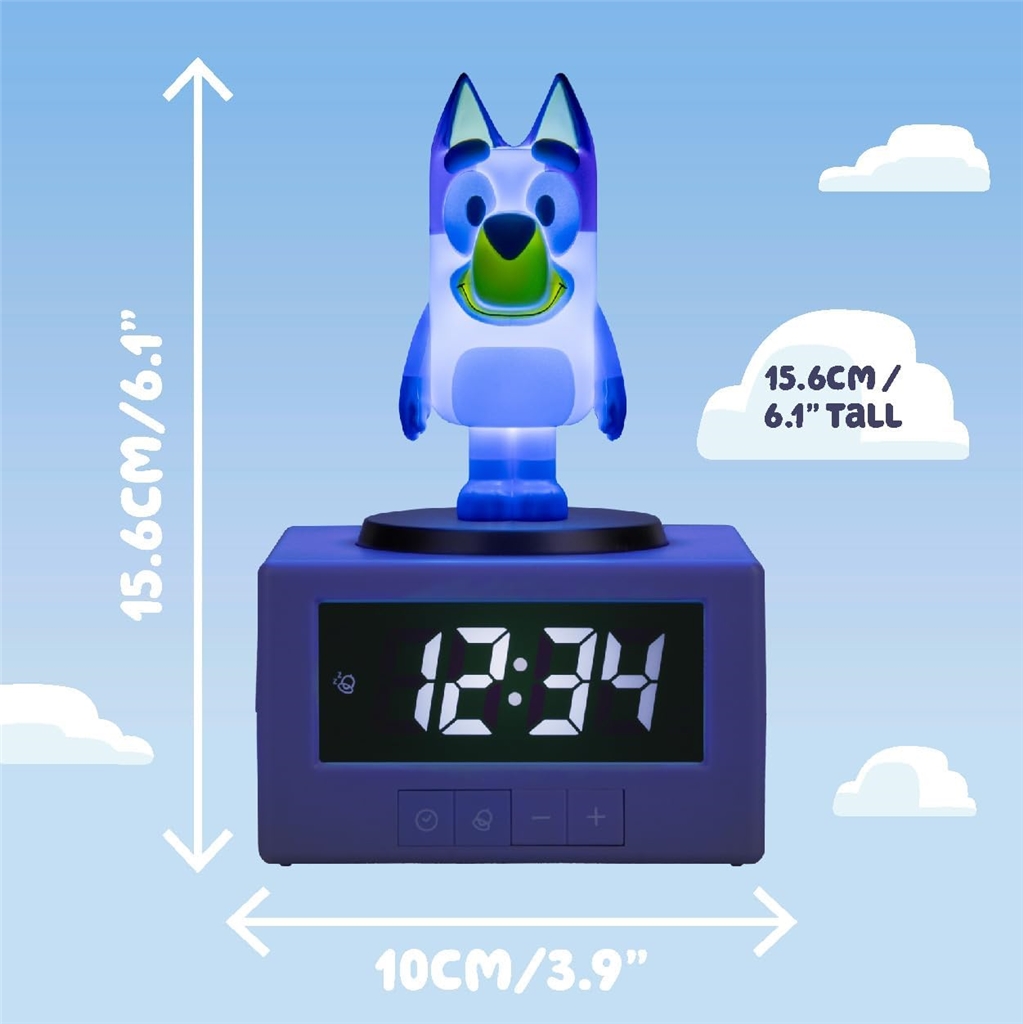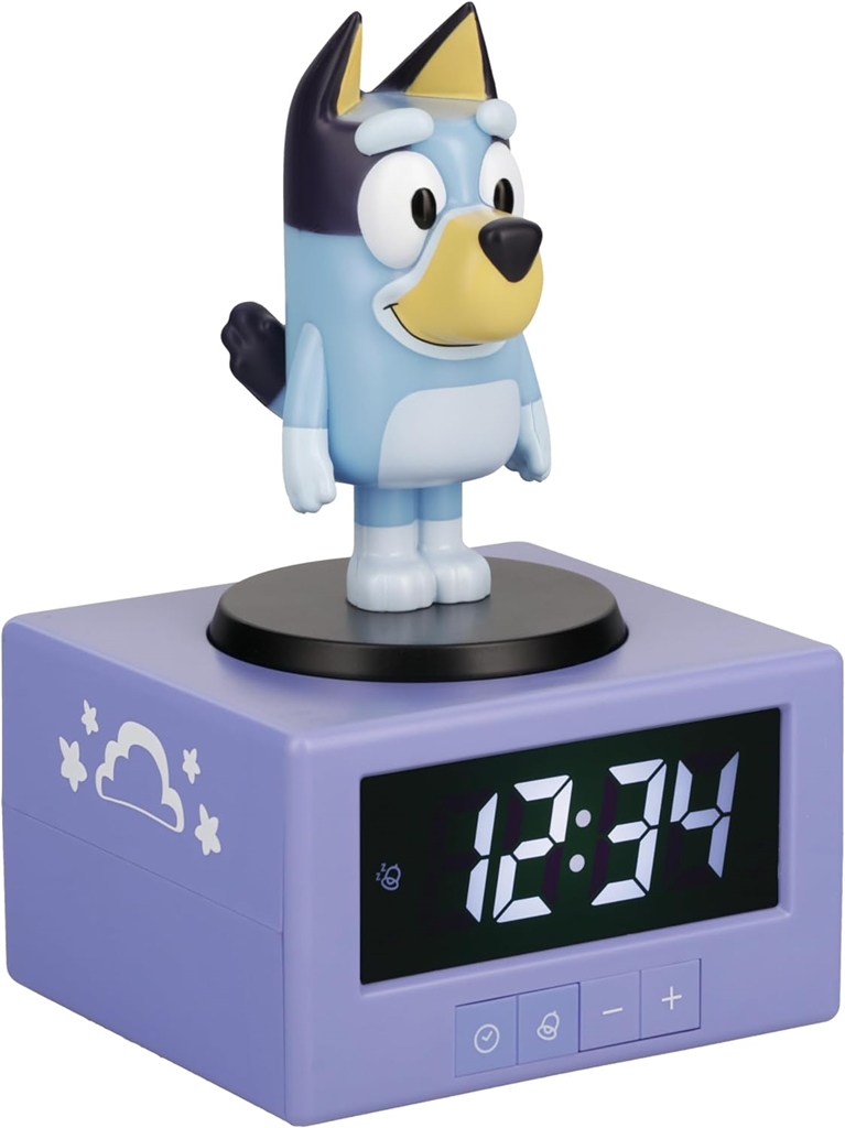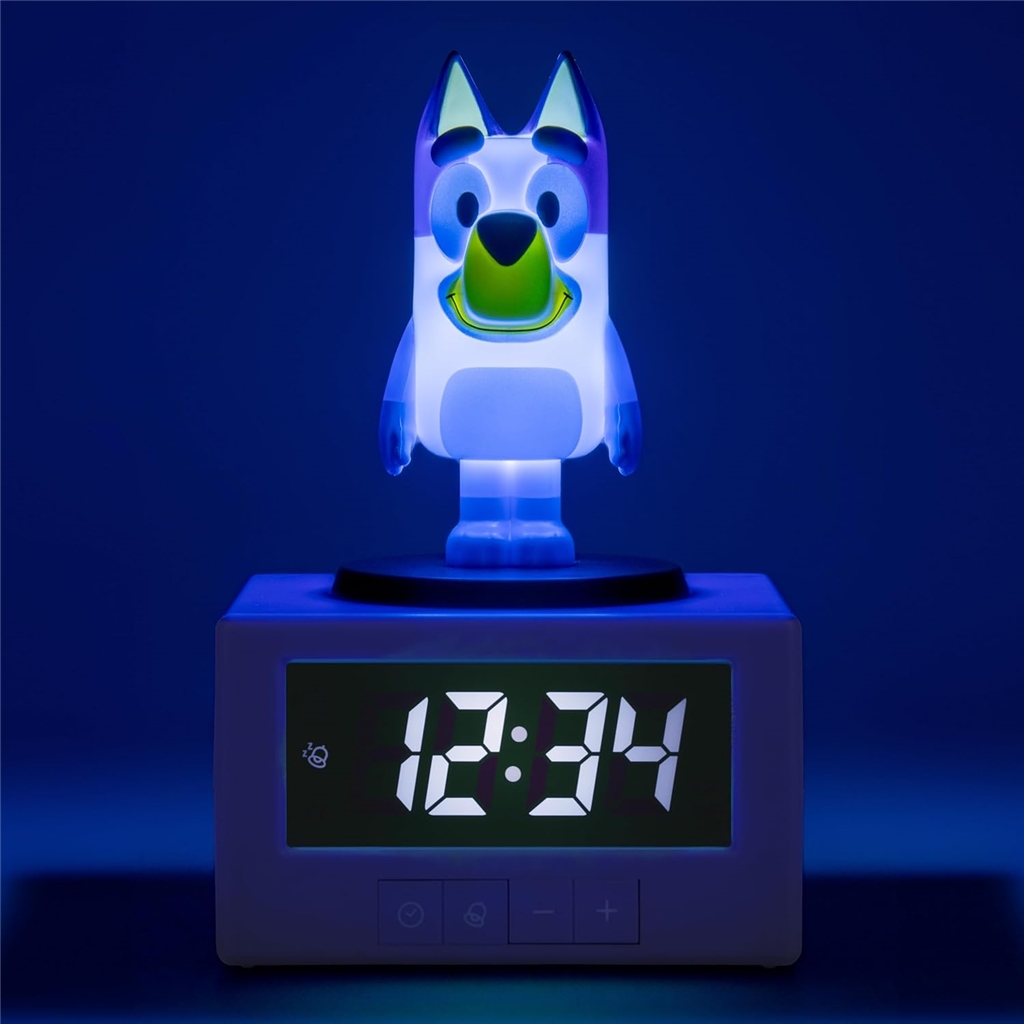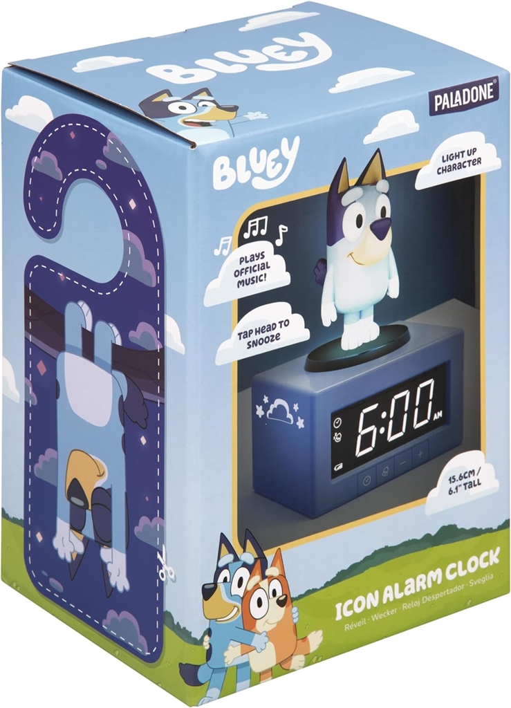 Digitalna budilka je visoka 15,6 cm in na njeni zgornji strani se nahaja figurica Bluey. Predvaja uradno uvodno melodijo televizijske oddaje, da vašemu otroku pomaga vstajati vsak dan - za dremež zadostuje, da potrkate po Blueyini glavi. Če pa pritisnete njeno glavo navzdol, aktivirate funkcijo nočne luči - idealno za dodajanje nežne osvetlitve v otroško sobo.