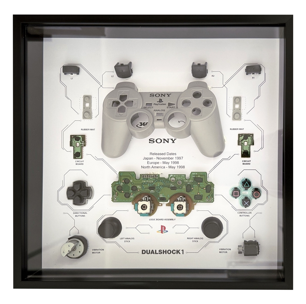 Razstavljeni krmilnik DualShock 1 za konzolo PlayStation 1 v globokem okvirčku.