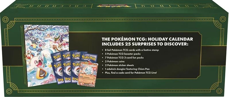 Praznujte božično sezono z 25 dnevi, polnimi presenečenj s kartno igro Pokémon TCG! Vsak dan lahko odprete drugo pokémonsko presenečenje - od posebnih sijočih kart do booster paketov in še več.