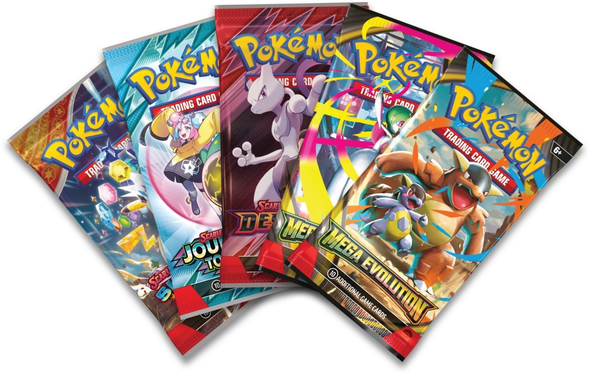 5x booster paketov z 10 naključnimi kartami iz izdaj Surging Sparks, Journey Together, Destined Rivals, Mega Evolution