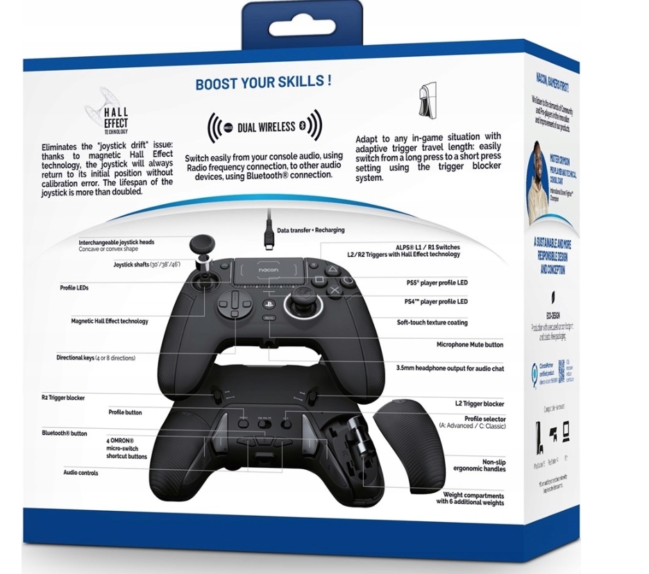 Popolna personalizacija: možnost ustvarjanja 4 profilov, 3 kompleti uteži, 3 možnosti spremembe nagiba analogov, 3 kompleti kapic analognih palic, 1 vtičnica za zunanji mikrofon.