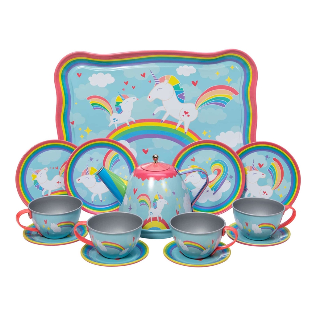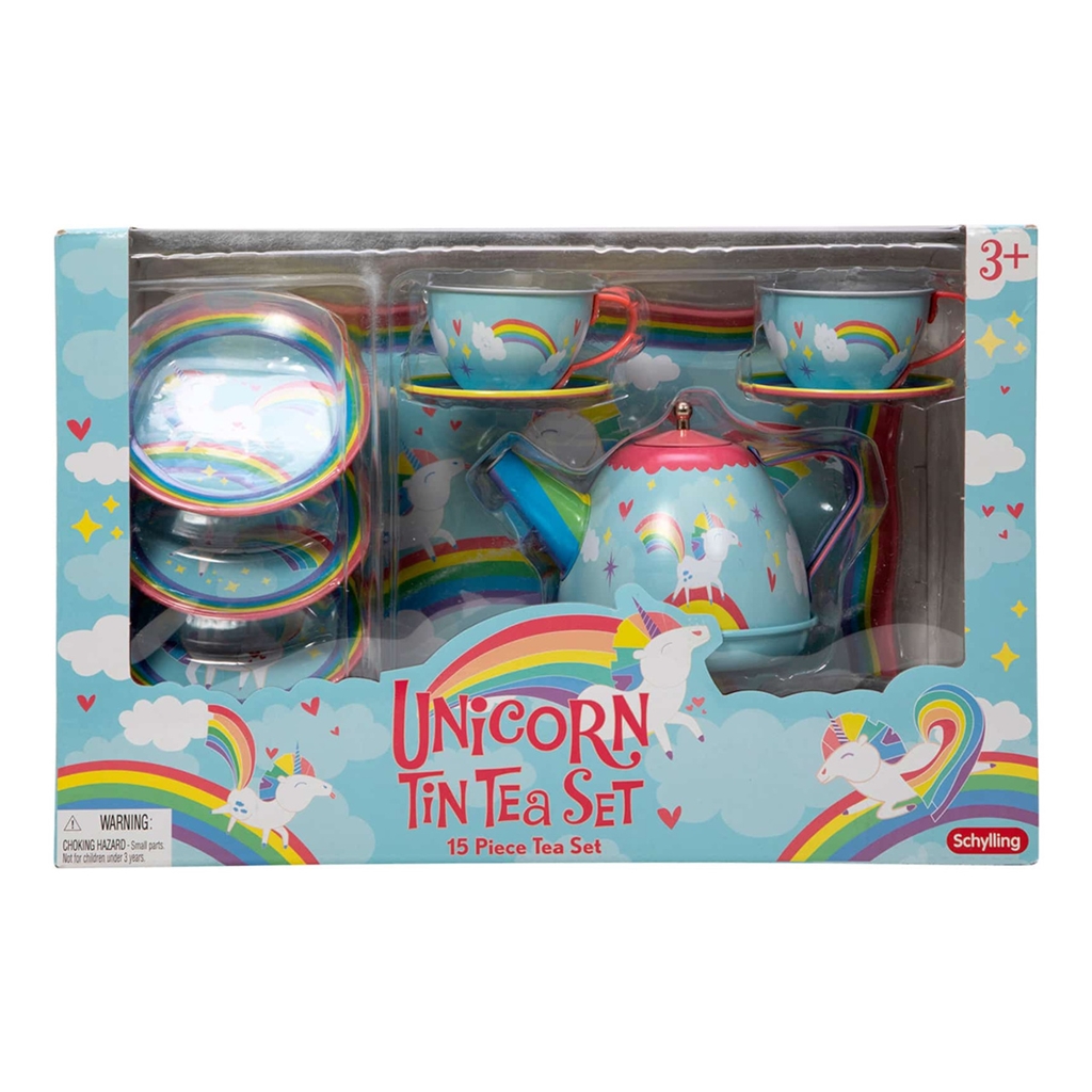 Čas je za čaj. Lepa 15-delna čajna garnitura iz kovine vsebuje 4 skodelice s podstavki, 4 desertne krožnike, čajnik s pokrovom in servirni pladenj, vse v motivu samoroga. Dimenzije servirnega pladnja so 24x16 cm. Kreativnost narašča, ko vaši malčki gostijo prijatelje, lutke in plišaste igrače s najslajšim čajnim setom vseh časov. Primeren za male gostiteljice in gostitelje, stare od 3 let. Glavne lastnosti: 15-delni čajni set idealen za namišljene čajne zabave motiv samoroga. Dimenzije pakiranja: 30,8x9,5x19,7\Starost: 3+