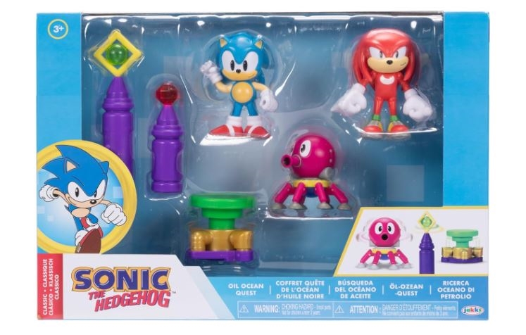 Figurka ježka Sonic Hedgehog Oil Ocean, 6 cm. Ustvarite svojo zbirko Sonic Oil Ocean Quest iz videoigre Sonic the Hedgehog™. Komplet vsebuje 6 cm figurice in elemente okolja, ki pripovedujejo zgodbo o odpravi v cono naftnega oceana! Komplet vključuje 6 cm figurice klasičnega Sonica, klasičnega Knucklesa in klasičnega Octusa ter dva stolpa Obelisk in elemente okolja Burner Cap Platform. Klasični Sonic in klasični Knuckles imata 5 točk artikulacije na glavi, nogah in ramenih. Klasični Octus ima 1 točko artikulacije. Del kompleta so tudi dodatki Burner Cap Platform in stolpi Obelisk za dopolnitev zgodbe in razširitev dogodivščin. Ta dioramski komplet je idealen za oboževalce in zbiratelje ter oživlja kultni Sonicov svet podjetja JAKKS Pacific!