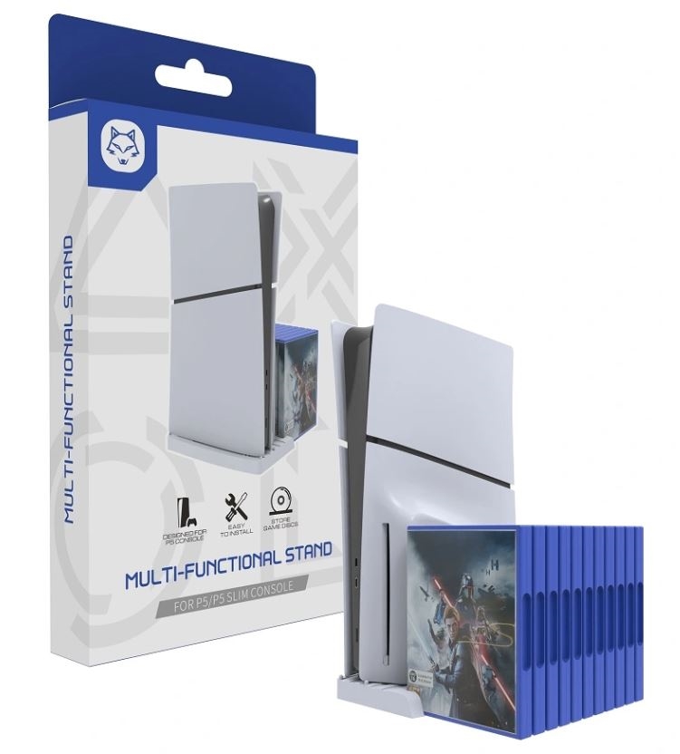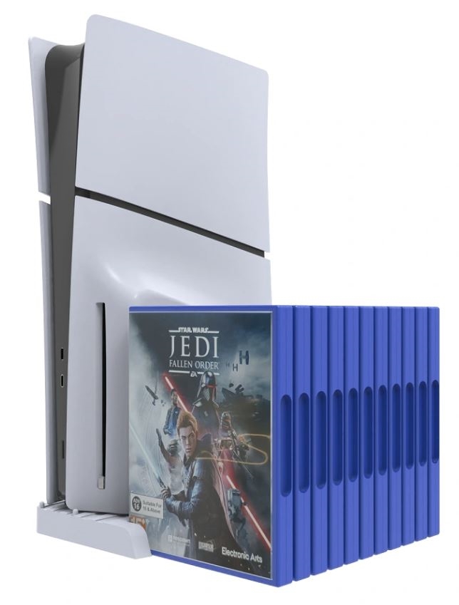 Elegantno in praktično stojalo za PS5 Slim, ki olajša organizacijo igralnega kotička in hkrati nudi prostor za shranjevanje igralnih diskov.
