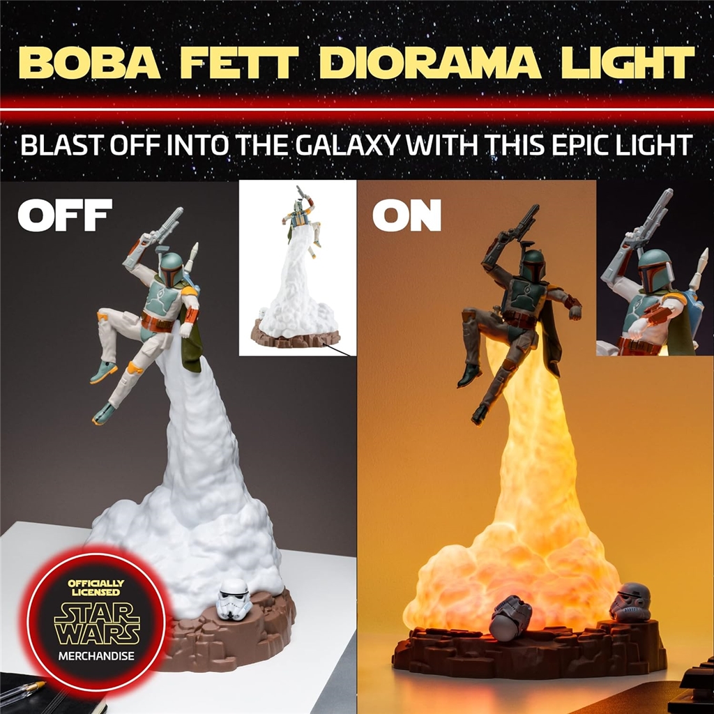 Ko se stemni, prižgite to zelo podrobno svetilko z lepim 3D-modelom letečega Boba Fetta. Celoten model ponuja obilico podrobnosti, ki jih je veselje odkrivati. Svetilka se napaja prek USB-kabla in ima tri nastavljive stopnje svetlosti, med katerimi lahko preklapljate z vrtenjem stormtrooperjeve čelade. Popolno darilo za vse oboževalce zgodb iz sveta Star Wars.