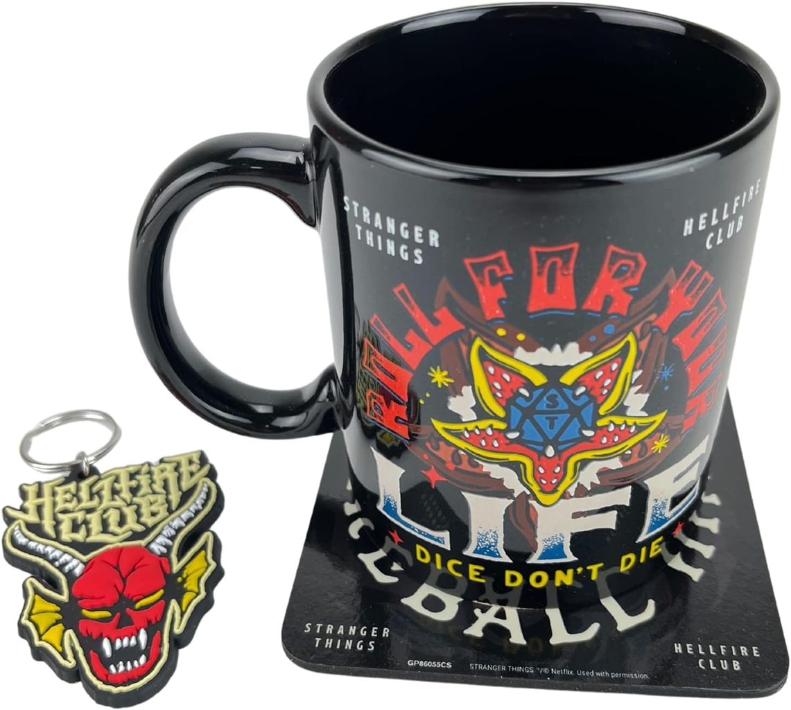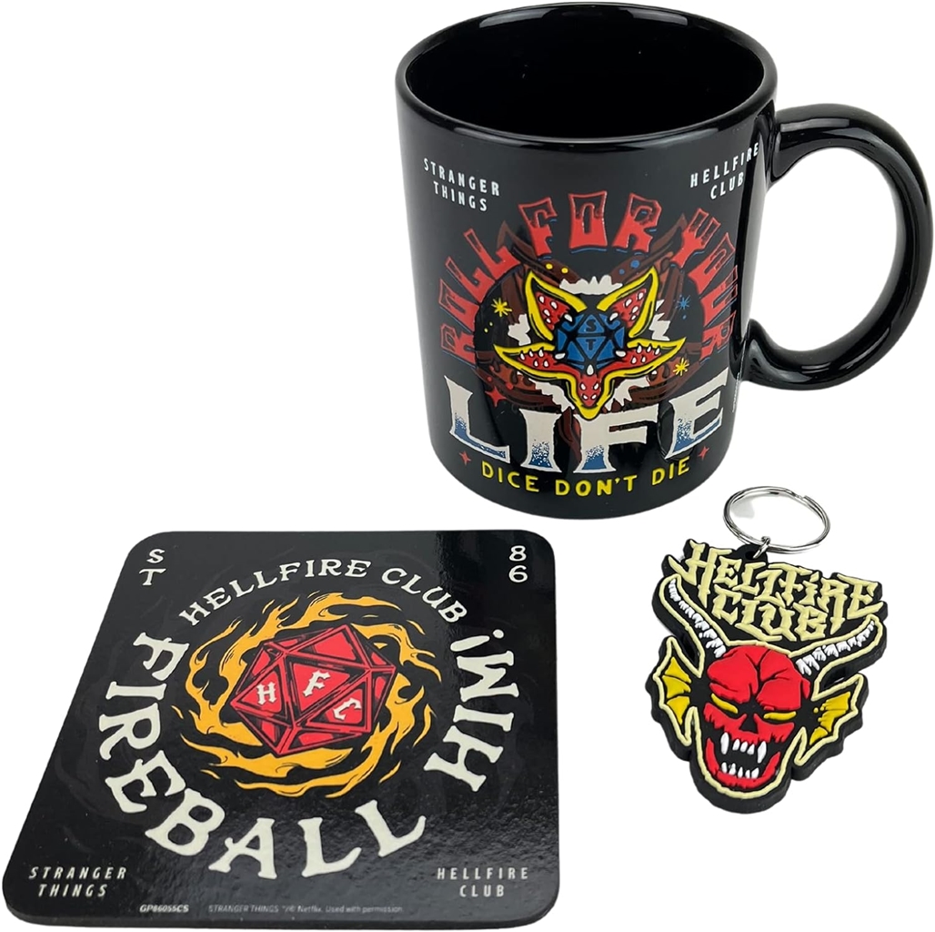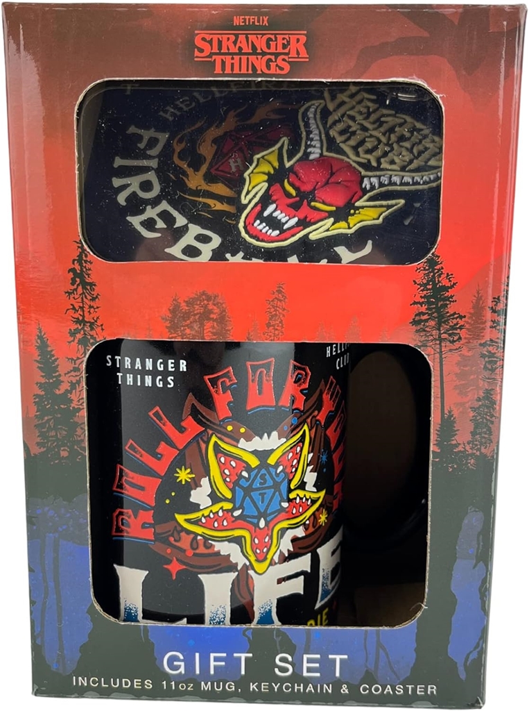 V darilnem kompletu za oboževalce priljubljene serije Stranger Things boste našli lep keramičen lonček, gumijast obesek za ključe in pluten podstavek - vse to z motivi Hellfire Cluba. Vse je pakirano v lepi darilni škatli.