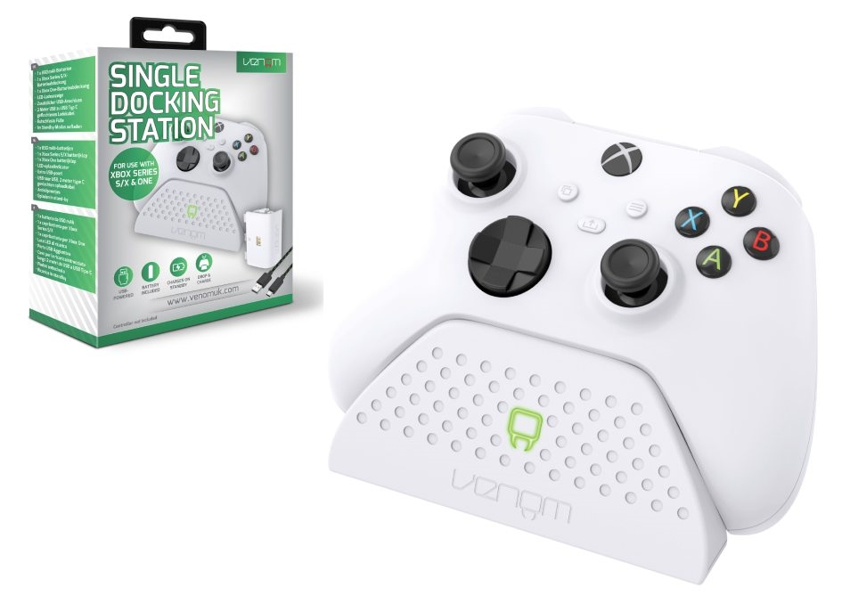 Dokacijska postaja, ki je estetsko zasnovana tako, da se ujema z vašo konzolo Xbox Series X, je opremljena s sprednjim LED zaslonom, ki med polnjenjem sveti rdeče in ob popolnem polnjenju krmilnika zasveti zeleno.