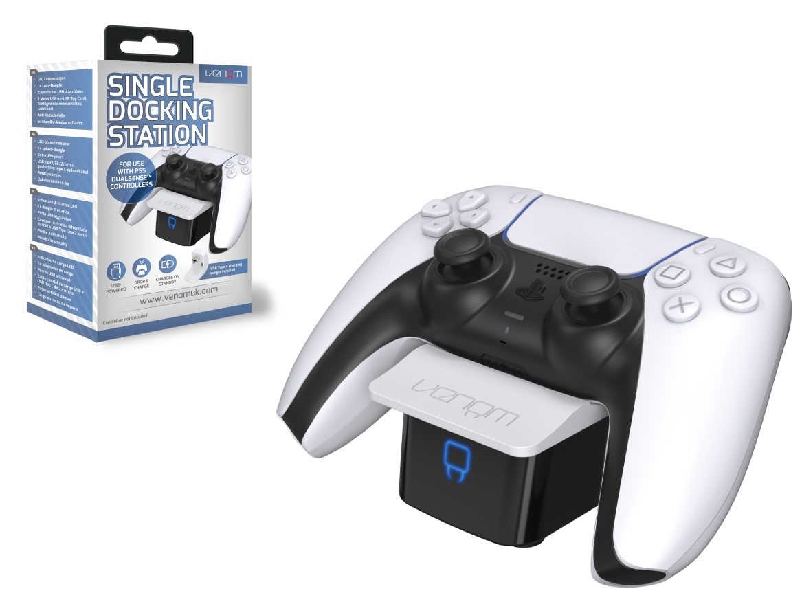 Dokacijska postaja estetsko zasnovana tako, da se ujema z vašo konzolo PS5 in krmilnikom DUALSENSE™, stilska polnilna postaja „drop and charge“ nudi hitro in učinkovito polnjenje vašega PS5 krmilnika.